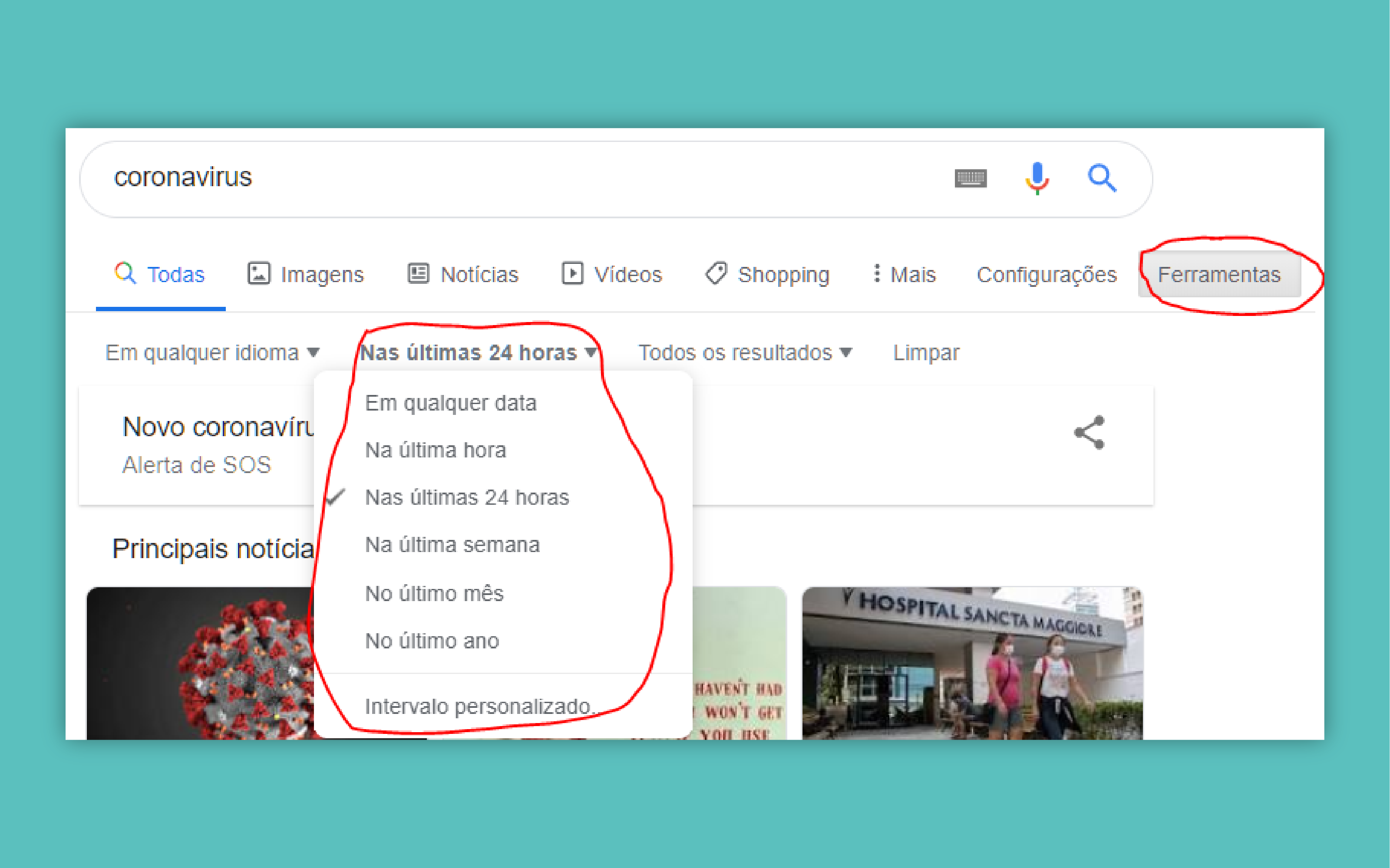 - Use a ferramenta de datação para buscar em fontes recentes ou de um período específico.